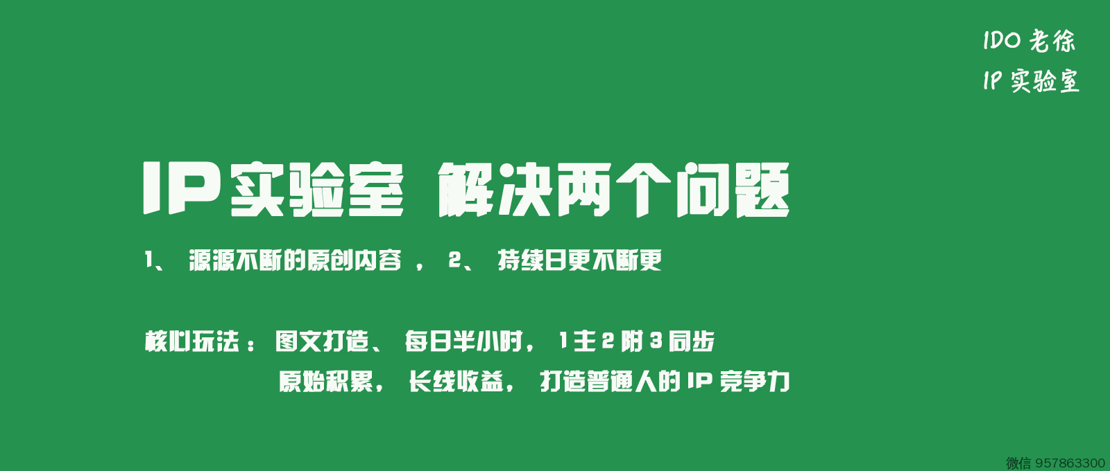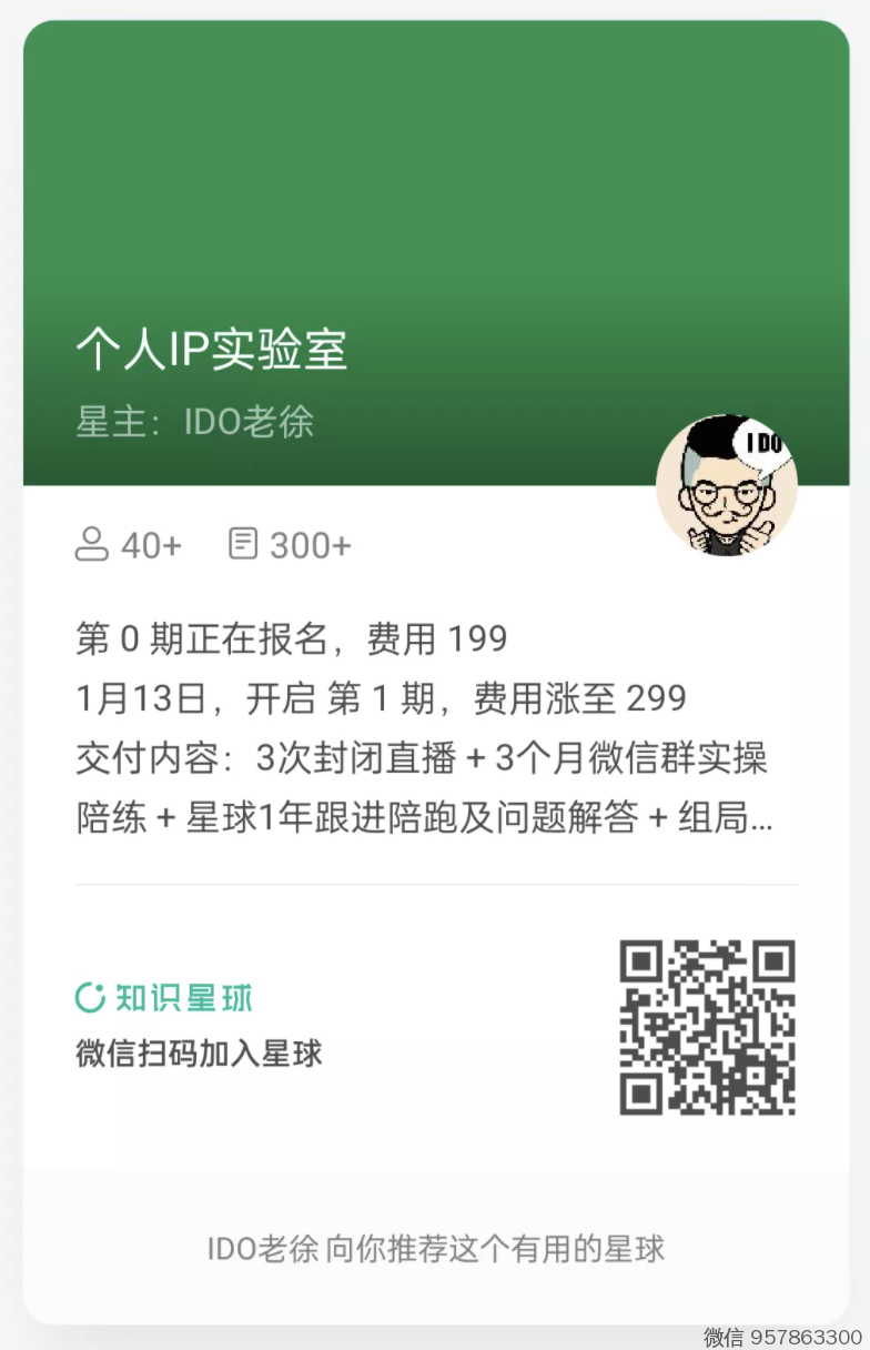 对 个人IP实验室 有具体疑问,可以微信 957863300 找我,一对一解答 。