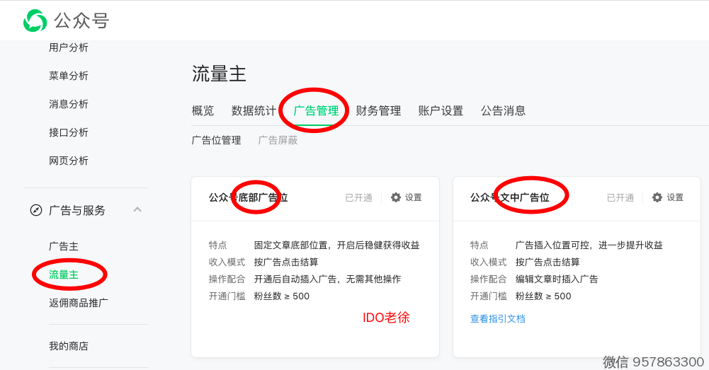 当你关注量500以后,就可以开通 「流量主」了